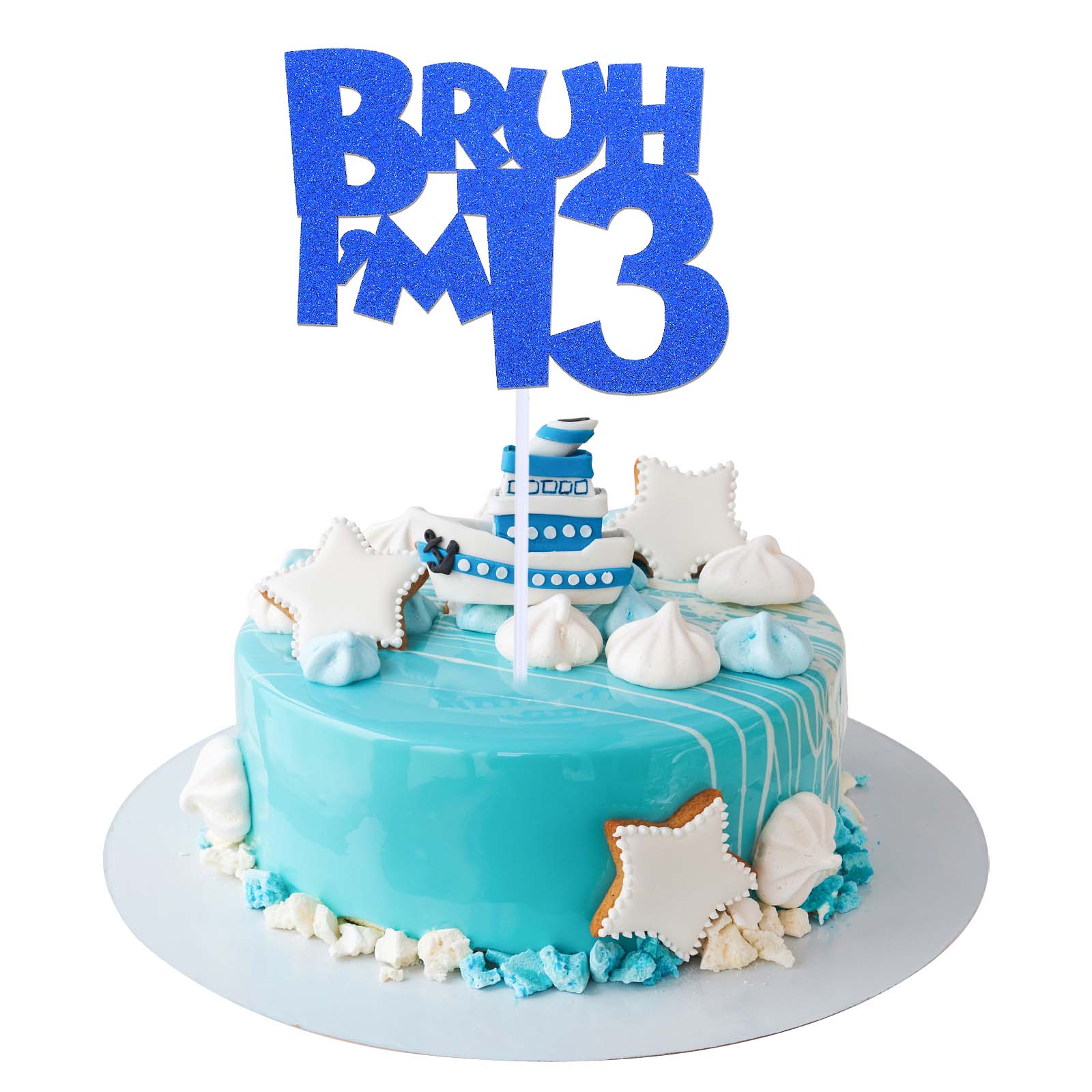 Celebrate the milestone of turning 13 with the bruh I'm 13 cake topper, a perfect addition to 13th birthday decorations for boy. This glitter funny 13th birthday cake topper is designed to make your big brother's 13 year old party decoration supplies stand out. Crafted with high-quality blue glitter, it adds a touch of sparkle and fun to your happy 13th birthday cake topper