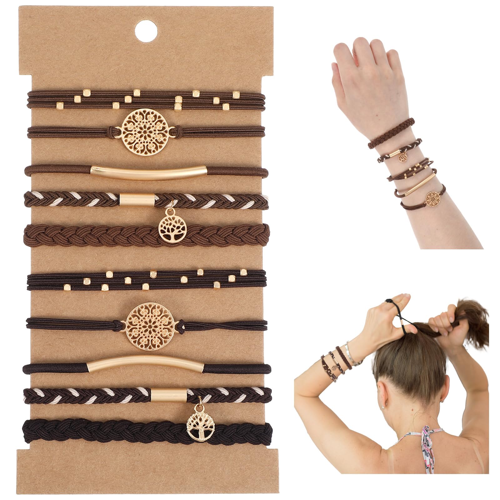 10 PCS Hair Tie Bracelets for Women Ponytail Bracelets Soft Braided Boho Hairs Bands Boho Dual-Use Bracelet and Hairs Tie for Women Thick Thin Long Curly Hair Ponytail Holders (Brown+dark Brown)