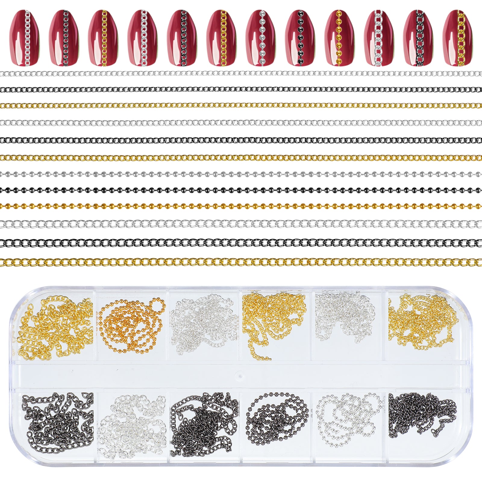 12 PCS Metal Nail Art Chains, Gold Silver Black Nail Chains with Box, 3D Decorations Charms Personality Nails Jewelry Design Ornaments for DIY Manicure and Nails Design