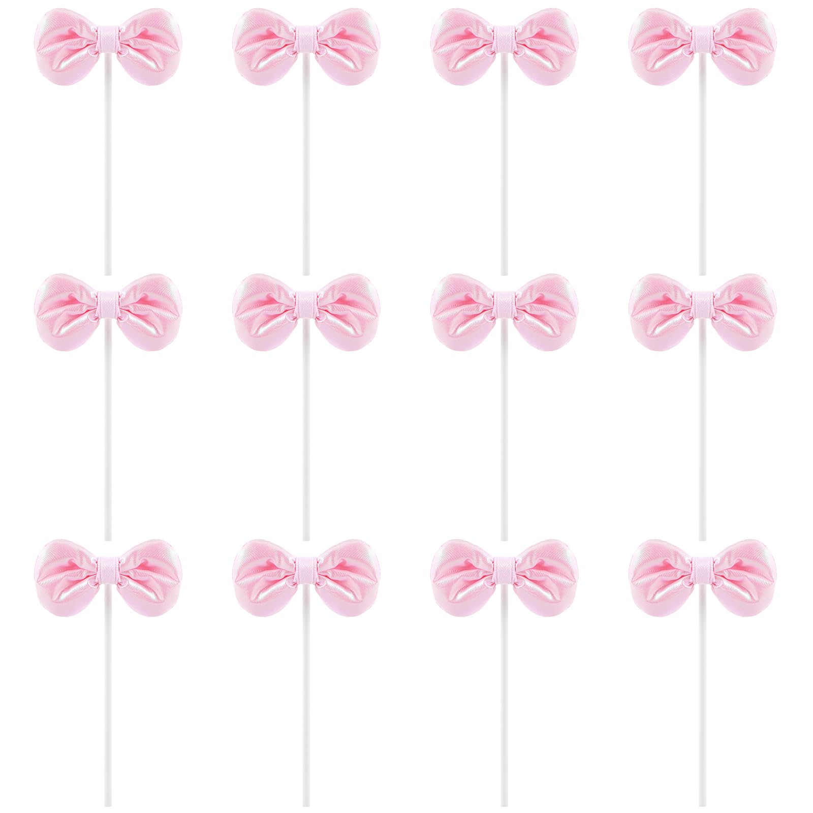 12 PCS Pink Bow Cake Topper Pink Bow Cupcake Toppers Bowknot Cupcake Picks Baby Shower Cupcake Toppers for Bachelorette Bridal Engagement Wedding Girl Baby Shower Theme Party Decor