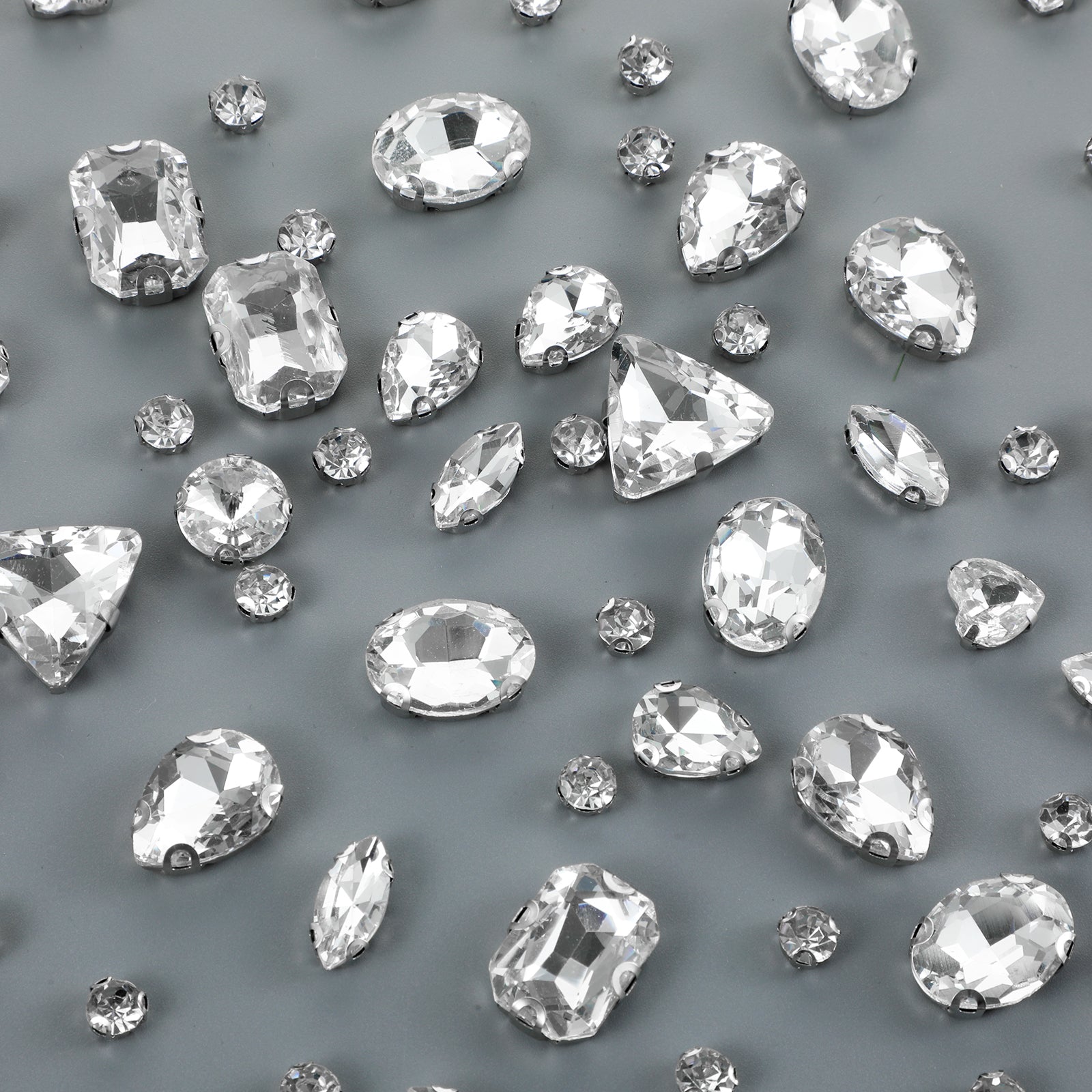 130PCS Sew on Rhinestones for Crafting, Mixed Shapes Crystal Glass Gems with Mental Flatback Claw Embellishments, Bedazzling Rhinestones for Jewelry Making Costumes Clothes Shoes Garment Sewing, White