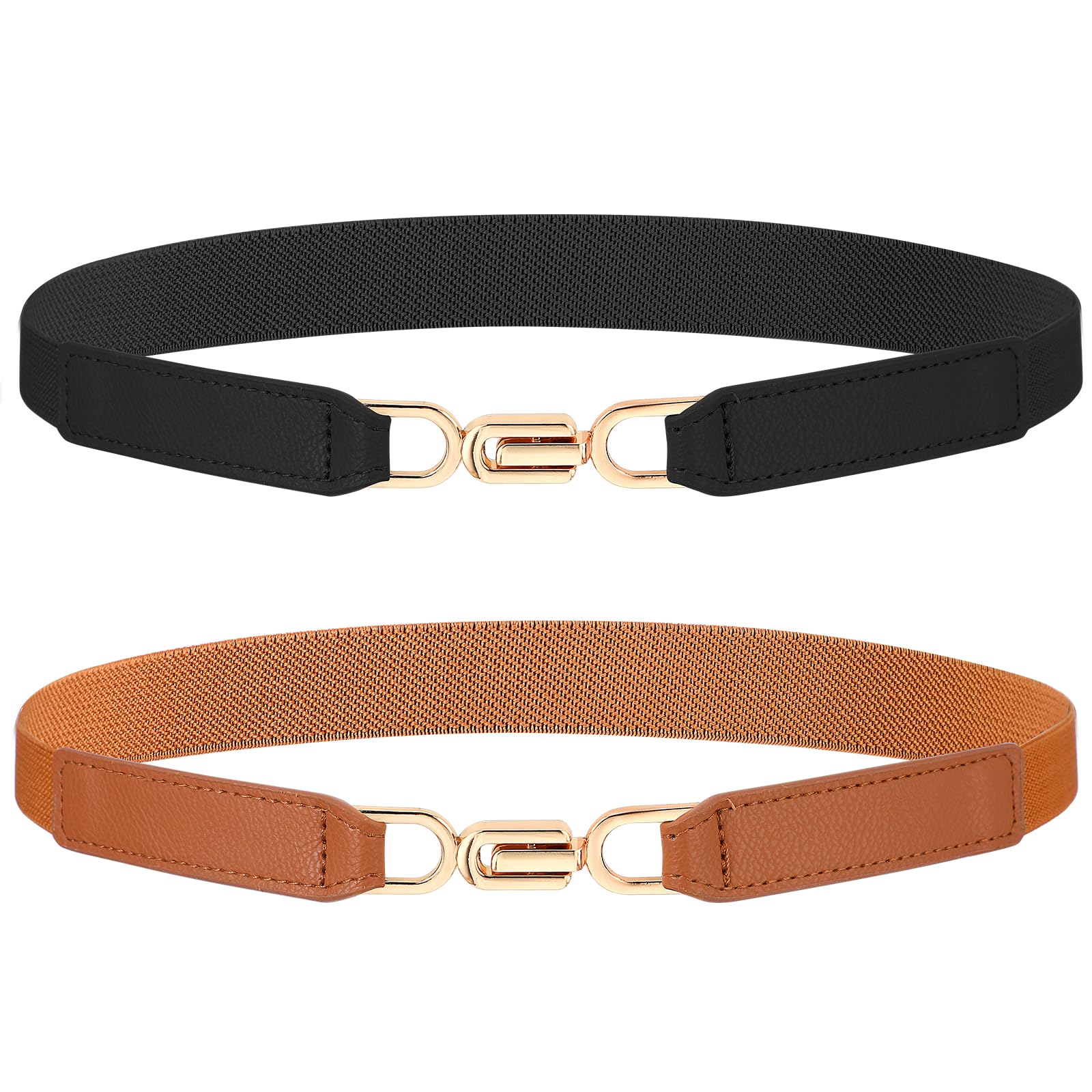 2 Pack Ladies Elasticated Belt for Women, Stretchy Skinny Waist Belt with Gold Buckle, Thin Retro Elastic Waist Belts for Ladies Plus Size, Adjustable PU Leather Belts for Dresses and Jeans