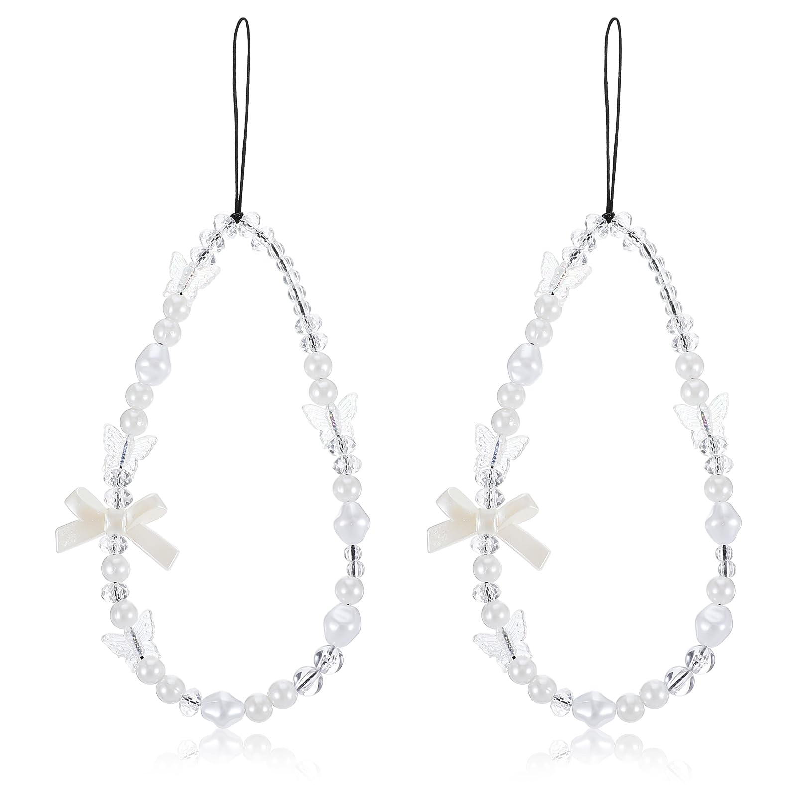 2 Pcs Beaded Phone Charm Beaded Phone Strap Cute Aesthetic Phone Chain Bow White Pearl Beaded Phone Lanyard Wrist Strap Anti Lost Phone Charm Strap for Women Hands-Free Bracelet Wristlet for Most Smar