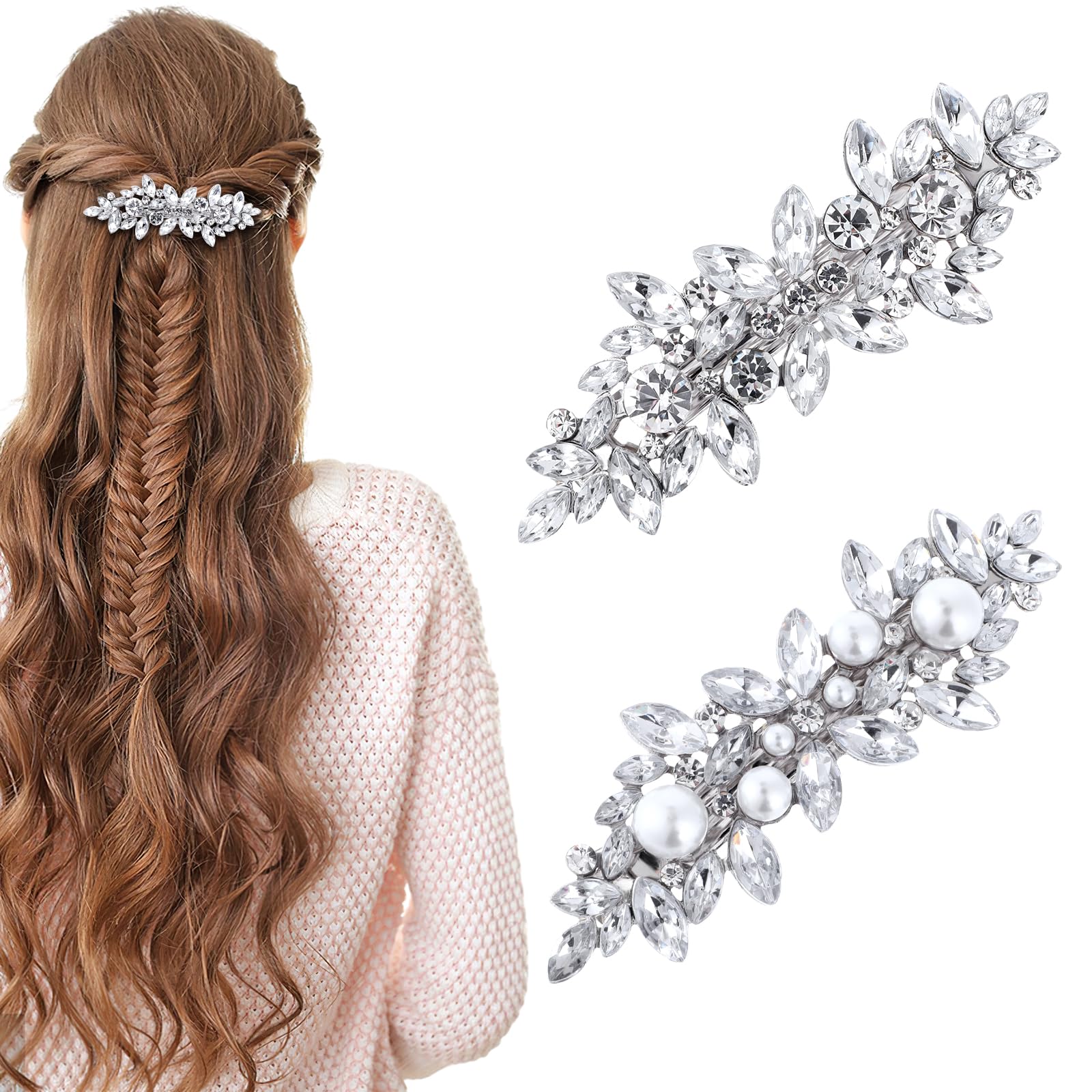 2 Pcs Rhinestone Pearl Hair Clips Bridal Wedding Hair Accessories Antique Crystal Barrette Silver Flower Leafy Pins Elegant Jewelry Hair Decorations Crystal Flower Hair Clips for Women Party Gift