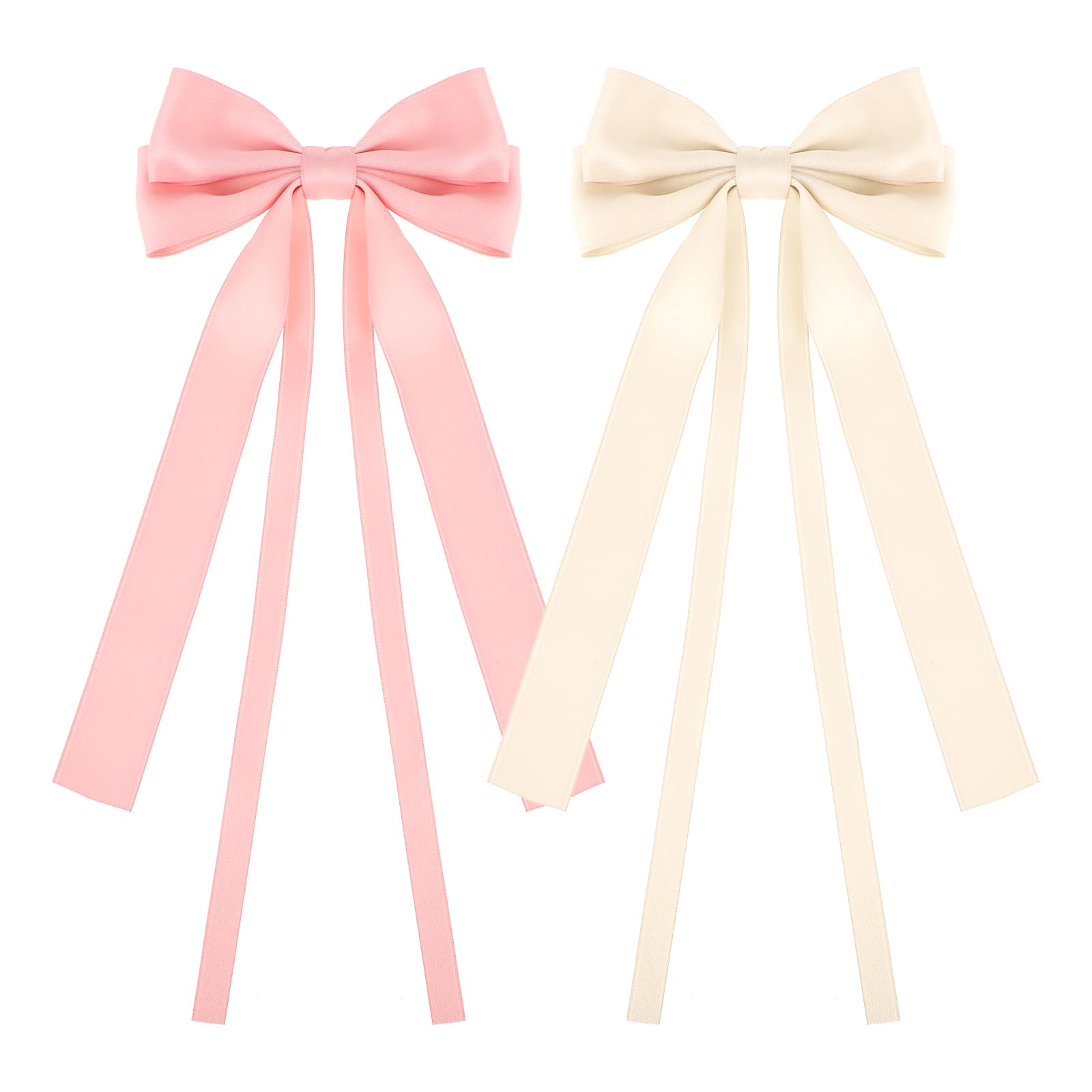 2 PCS Satin Bows for Hair Ribbon Bows for Women Silky Satin Hair Bows Coquette Bows Hair Bows for Women Long Tail Tassel Big Bowknot Accessories for Hair Design (Pink+Beige)
