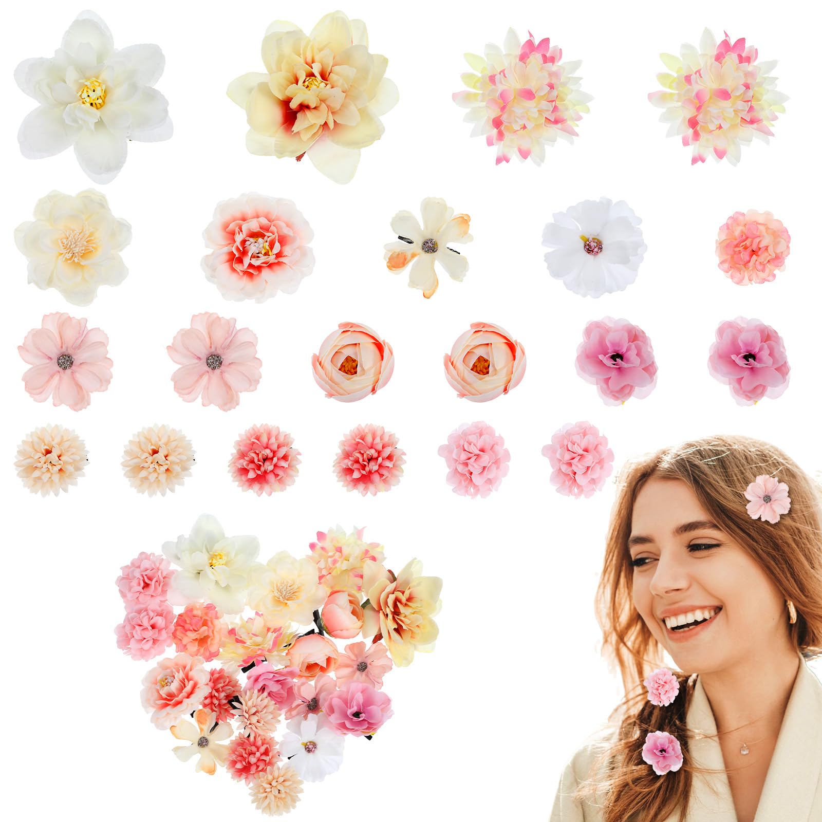 21 Pcs Realistic Flower Hair Clips, Silk Flower Hair Clip Pink Hawaiian Boho Hairclip For Girls Clip On Flowers Fake Flower Hair Clips For Party Wedding Graduation Cap Topper Decor (Pink, White)