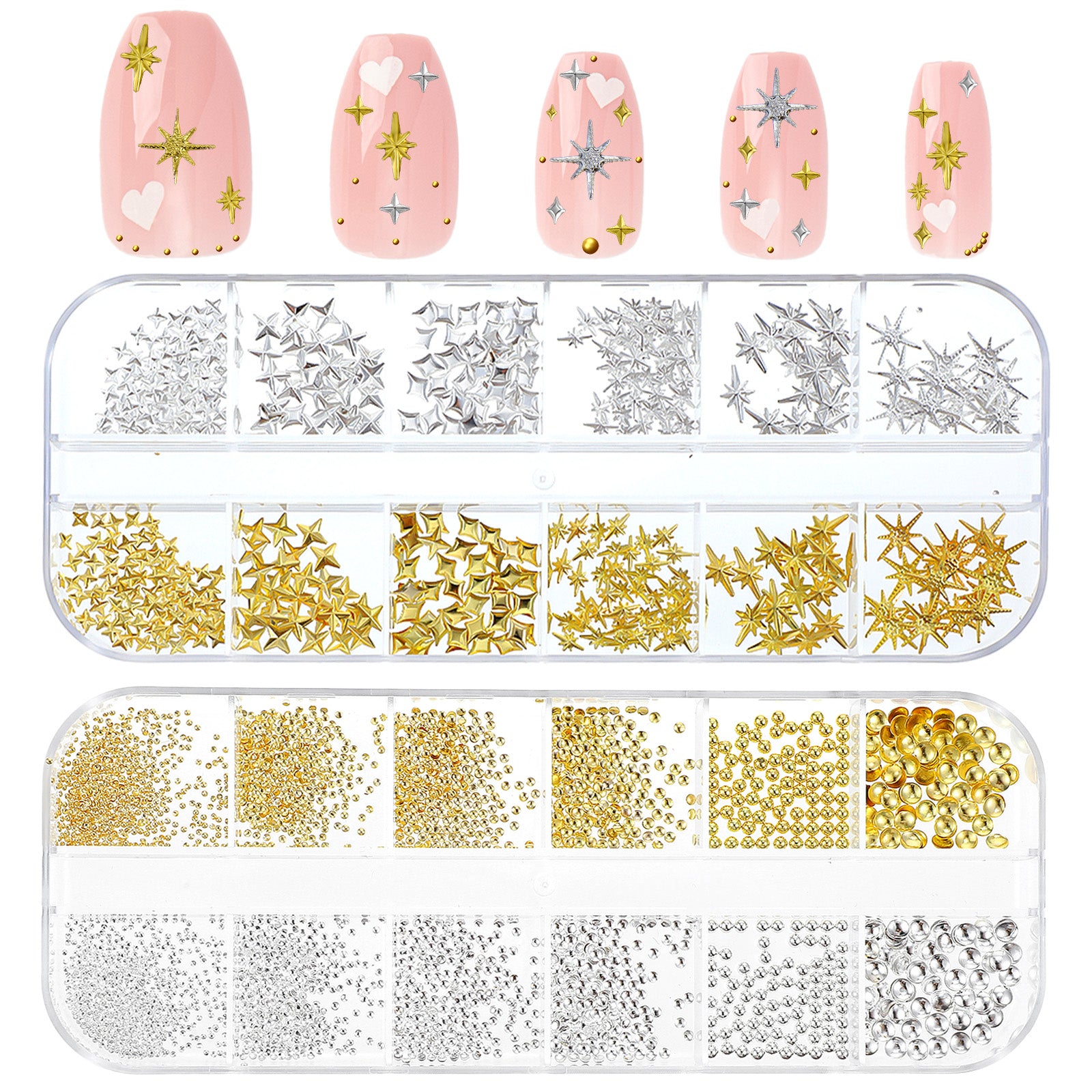 2200Pcs Gold and Silver Star Pearls Gold Nail Charms,Star Nail Charms and Studs,Sparkle Metal for Acrylic Stars Nails Rivet Studs, 3D Self-Adhesive Silver Nails Decals for Women Y2k Decor