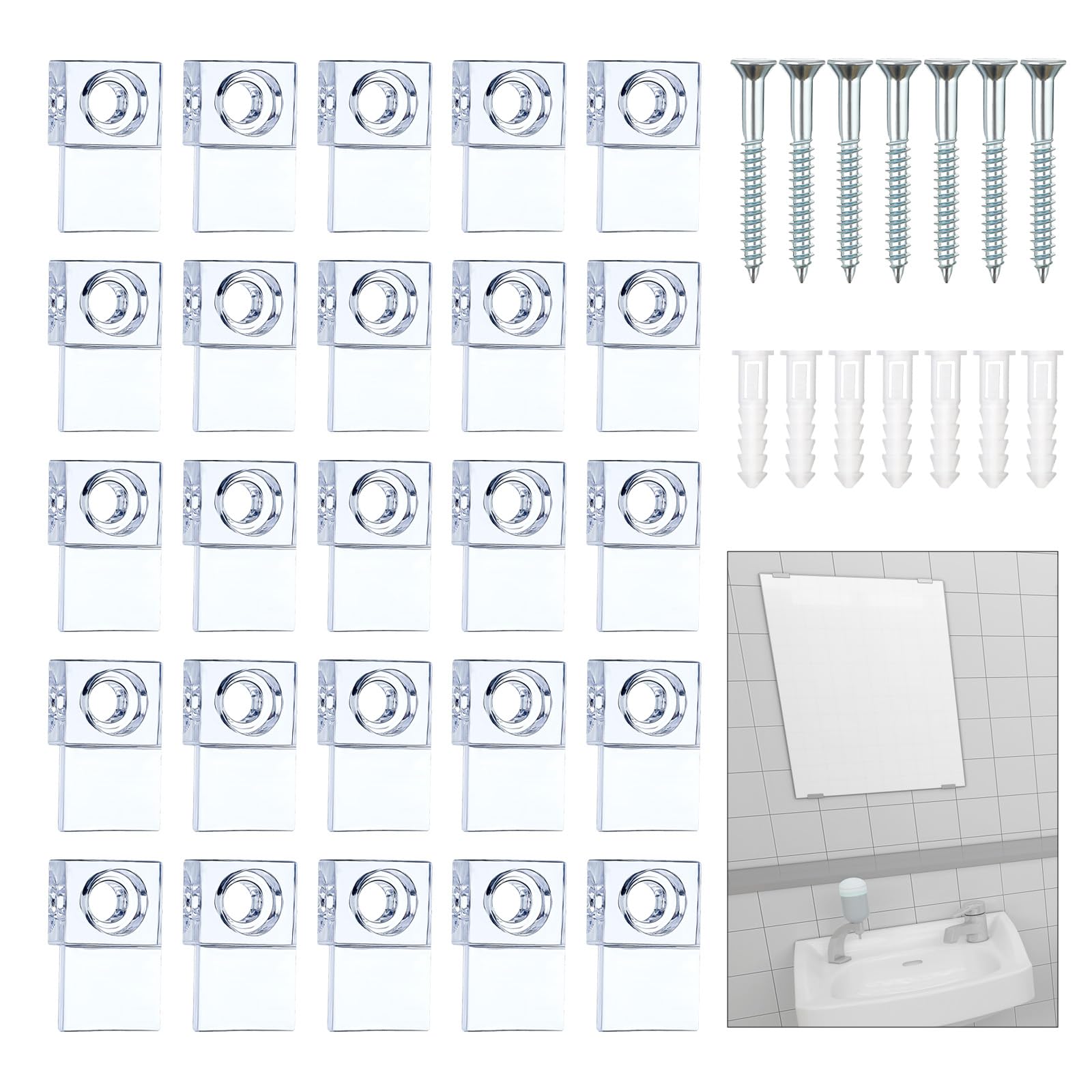 25 Set of Mirror Brackets, Crystal Clear Plastic Glass Retainer Clips Kit for Wall Mounting, Adjustable Mirror Clips with Screws, Frameless Mirror Hanging Kit and Fixed Mirror Box Door