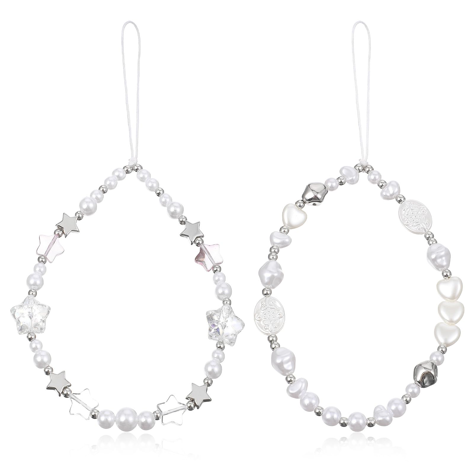 2PCS Phone Charm Wrist Strap Pearl Bracelet Wrist Strap Crystal Bracelet Lanyard Cute Star Camera Charms Phone Keychain Decoration for Women Bag Purse Backpack Wallet Pendants