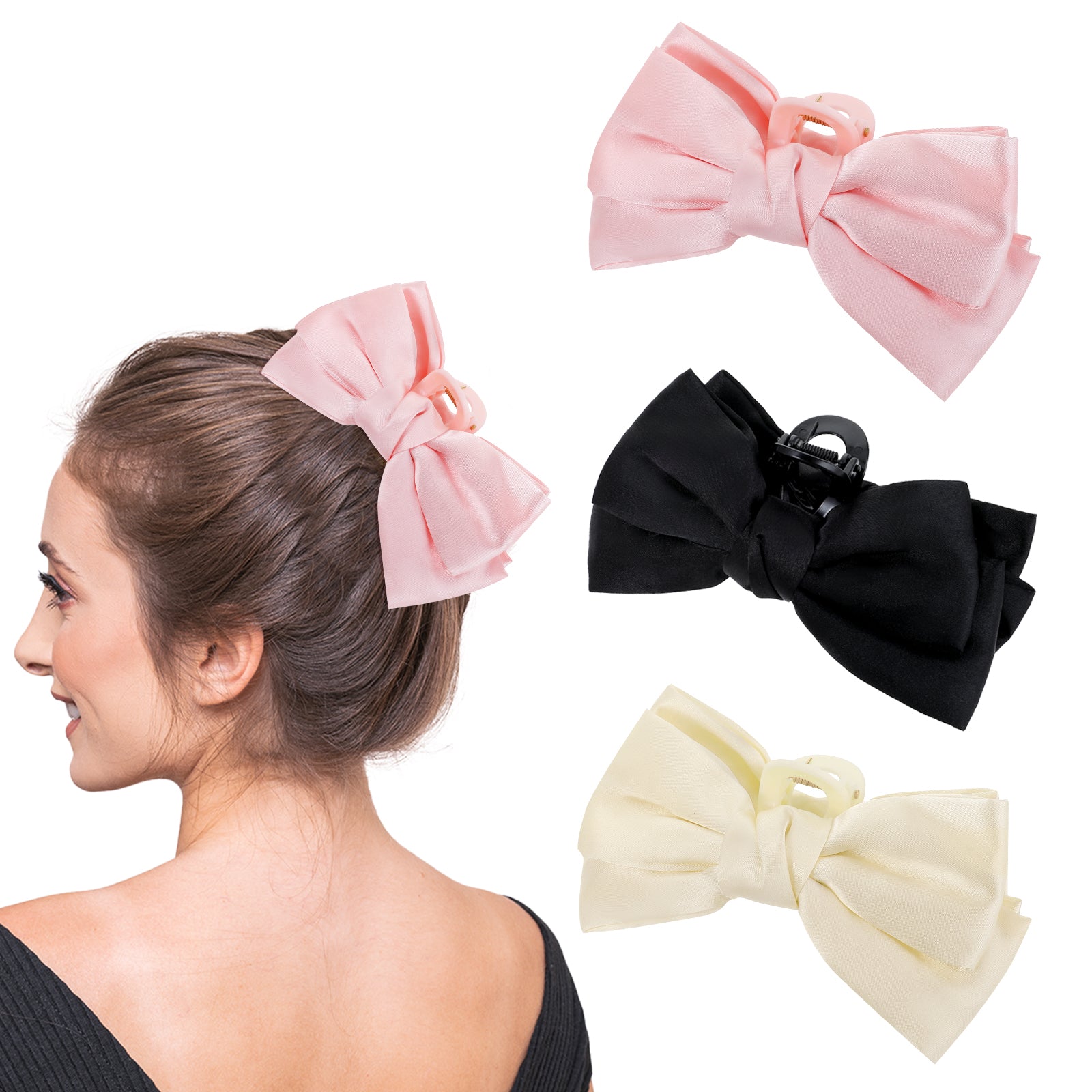 3 PCS Hair Claw Clips Satin Ribbon Hair Bow Clip for Women Girls, Nonslip Bow-Knot Hair Clamps Barrettes for Thin & Thick Hair(Black+White+Pink)