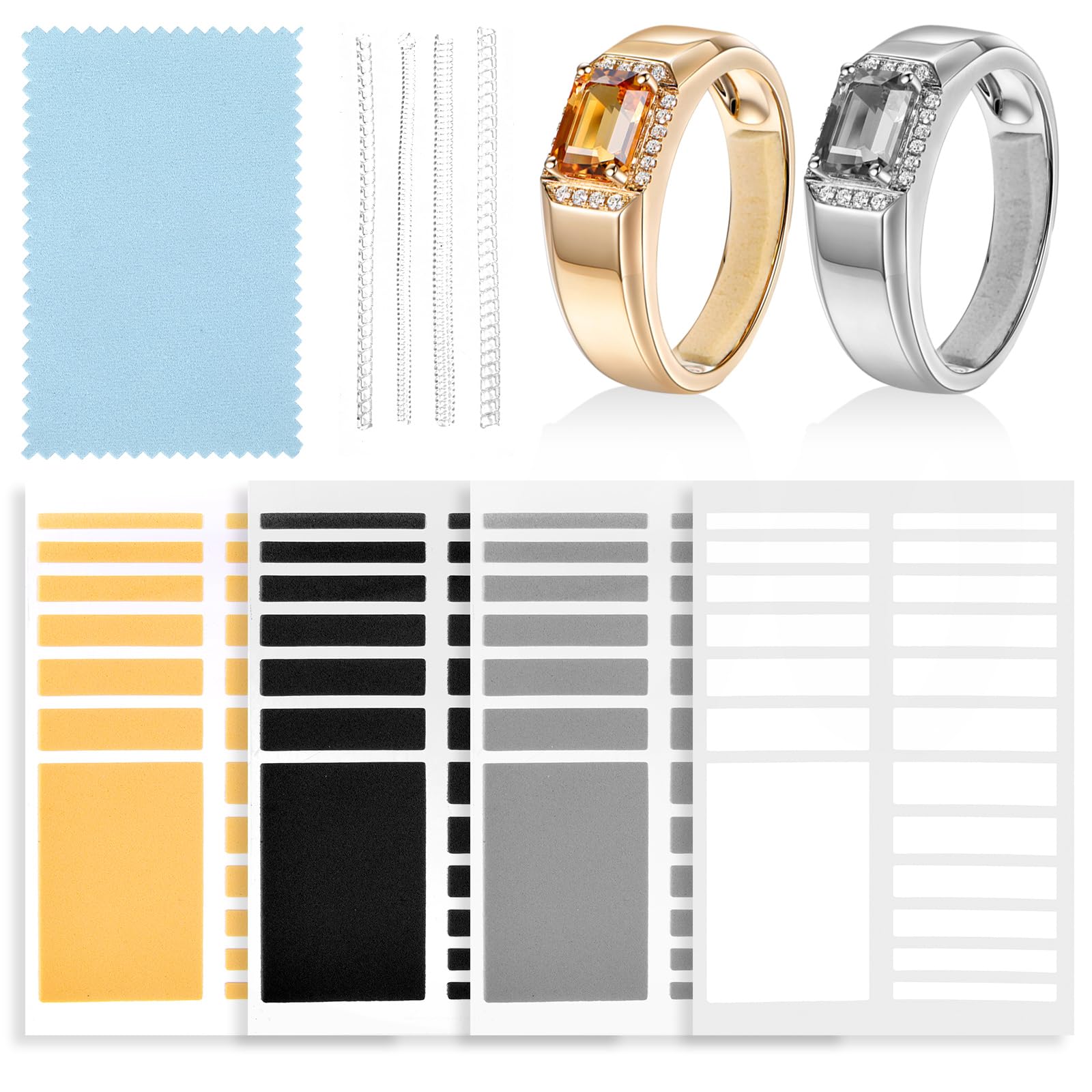 17 PCS ring guards for women loose rings: 3 pieces each of white, black, yellow and gray, 12 pieces in total, 4 plastic regulators, a blue silver polishing cloth