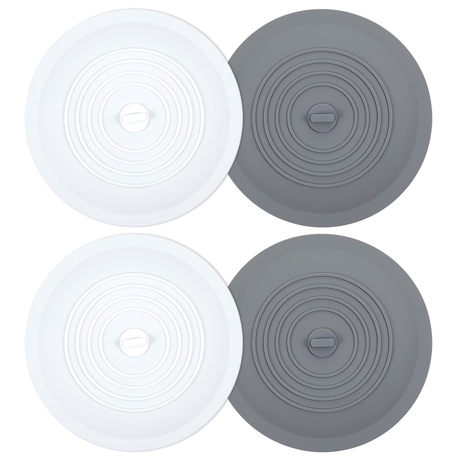 Manage household drainage needs with this 4-pack of versatile silicone drain stoppers featuring two white and two gray 6-inch diameter discs. These flexible bathtub stoppers drain plug accessories utilize flat suction technology to create effective seals over various drain openings, helping prevent hair, soap residue, and other debris from entering plumbing systems. Crafted from durable silicone material, these multi-purpose stoppers function as hair stopper for shower drain protectors, kitchen sink drain stopper solutions, and general drain covers for laundry or bathroom applications. The universal design accommodates different drain types and sizes up to the disc diameter, while the suction mechanism helps maintain position during use without permanent installation.