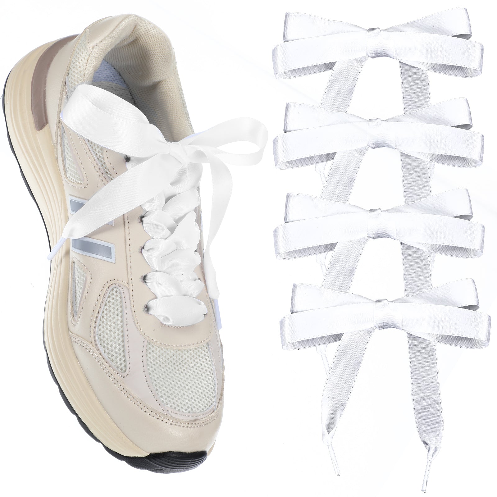 Tyqour 2Pairs 47" Ribbon Shoe Laces 2cm Wide White Shoelaces Ribbon Laces For Shoes Flat Shoelaces Silk Satin Shoe Laces For Sneakers Shoe Strings For Athletic Shoes Running Shoes Sneakers Boot Women