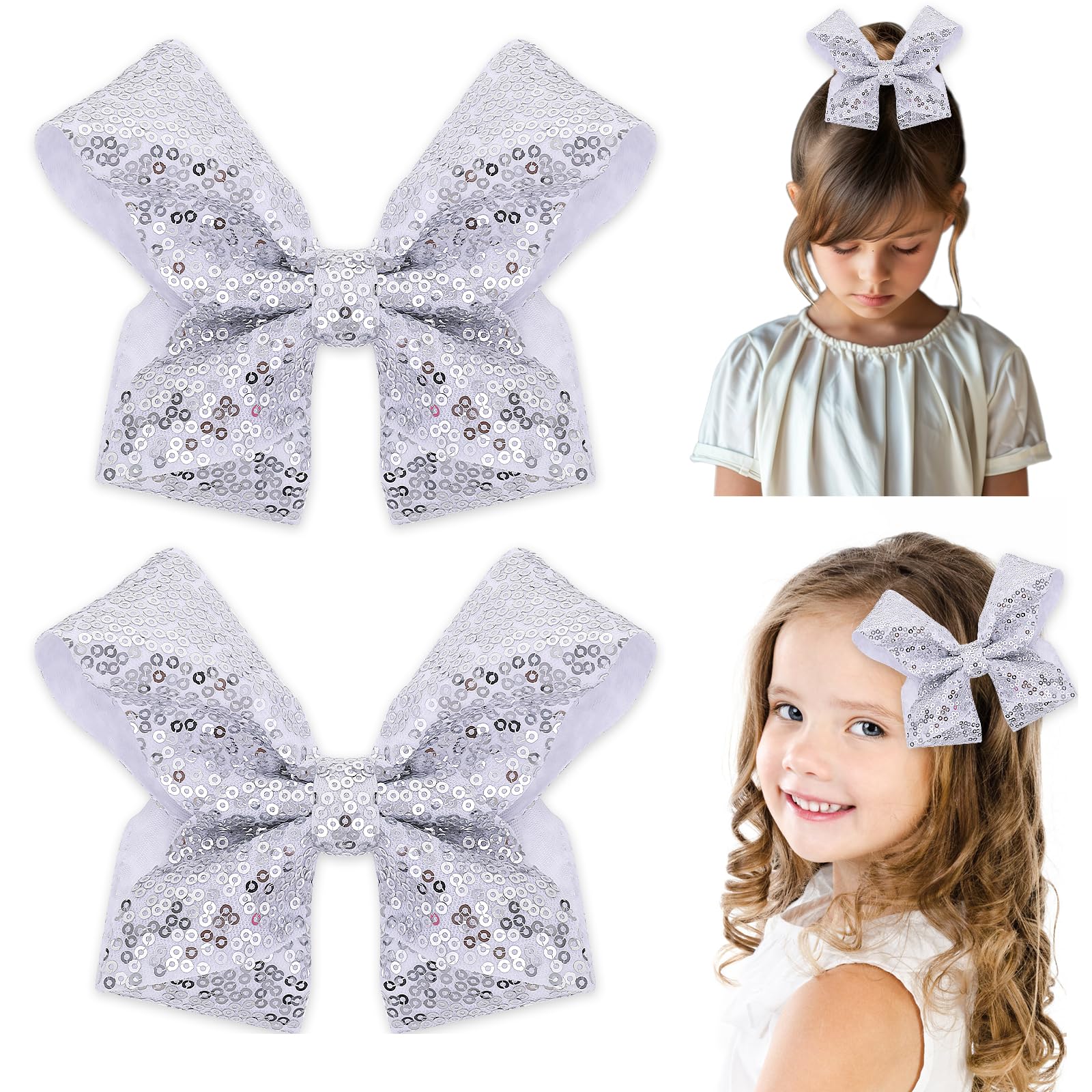 Tyqour 2pcs 5 Inch Silver Hair Bows for Girls, Glitter Bows for Girls, Silver Hair Bow Fairy Fashion Silver Sequin Bow Alligator Clips Bows for Girls Toddlers Kids Women(Silver)