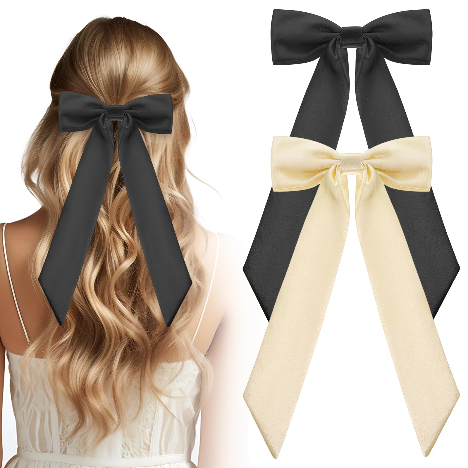 Tyqour 2pcs Silky Satin Hair Bows for Women, Black Beige Hair Ribbon Hair Clip Ponytail Holder Accessories, Ribbon Bow Hair Bow Clip for Girls Toddlers Teens Kids Women
