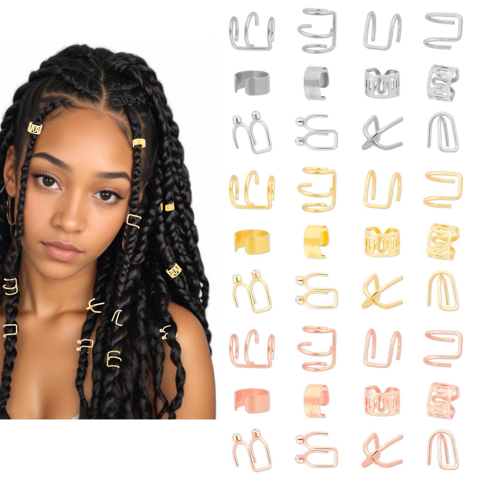Tyqour 36pcs Gold Hair Jewelry for Braids Accessories Hair Gold Silver Cuffs Adjustable Hair Rings for Braids Hair Charms for Braids for Women Men Hair Accessories Styling Tools