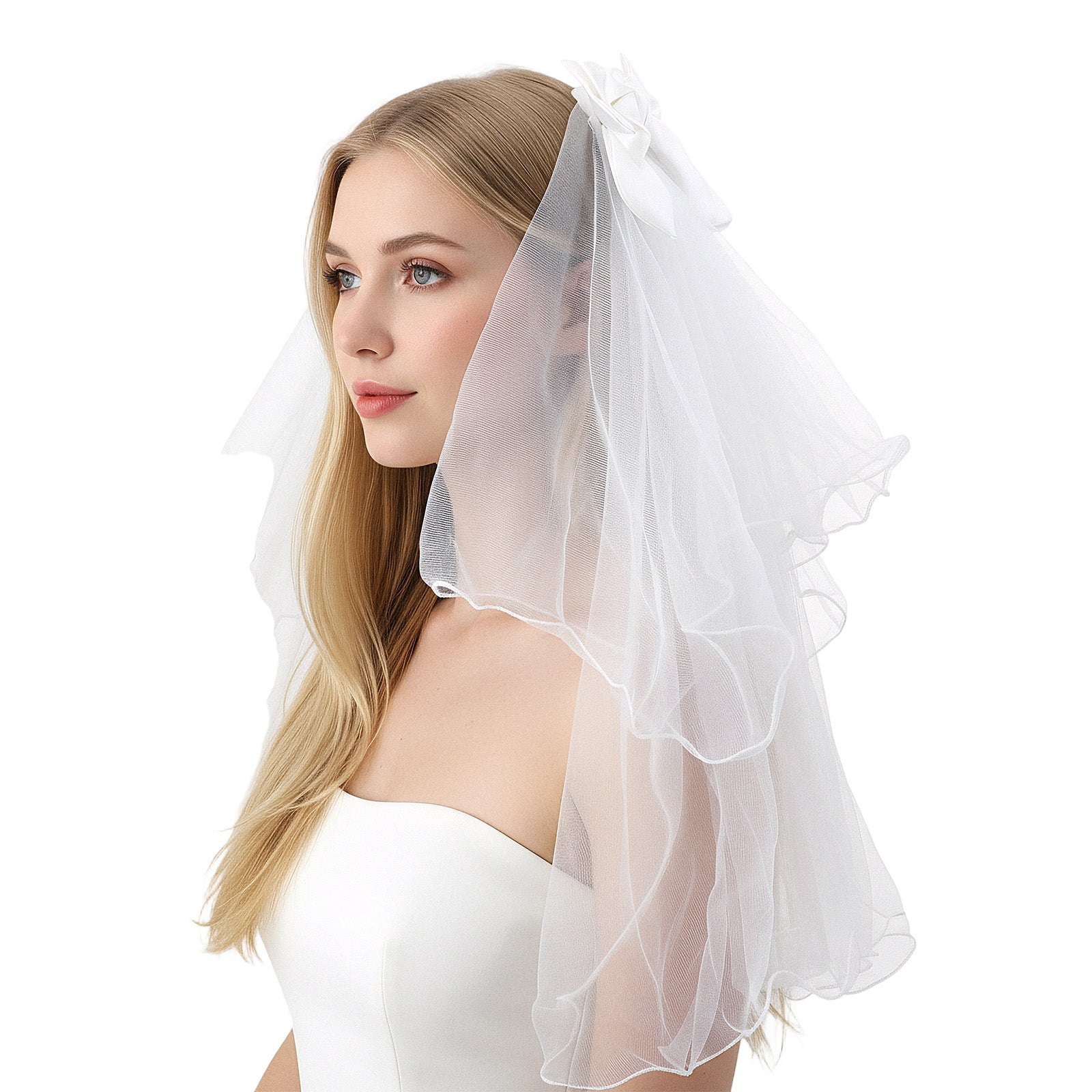 Wedding Veil Bow Size: Hair bow veil is about 55 cm / 21.65 inch long. Color: white. The bride wedding hair bow can decorate any dress, veils for women wedding design can be matched any outfits, wearing it will get more compliment in the crowd