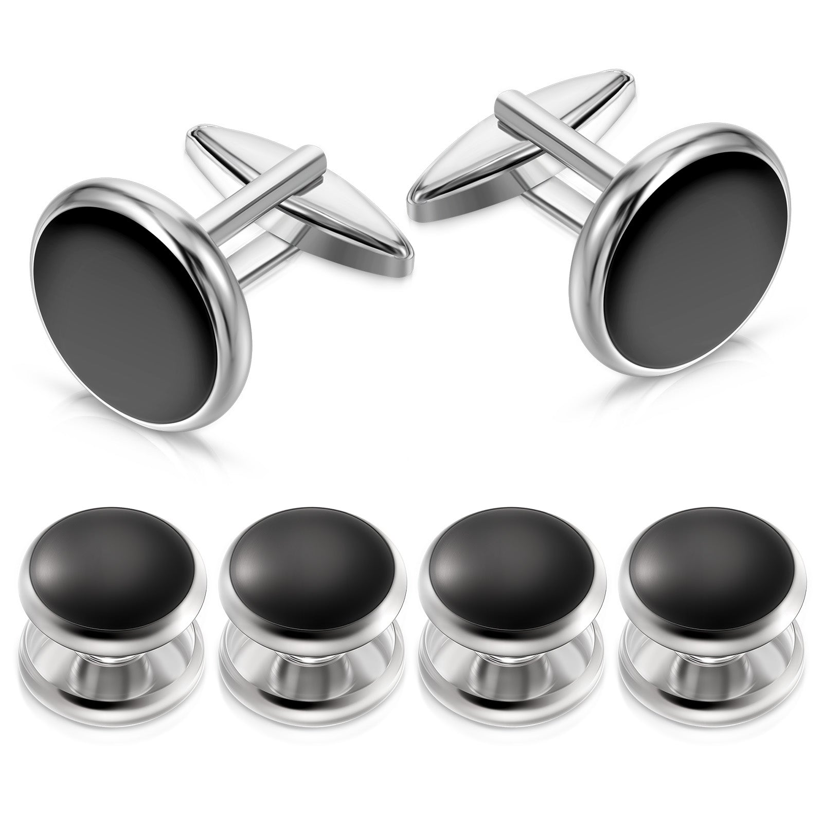 Tyqour Cuff Links Mens and Tuxedo Studs Set is the perfect addition to any man's jewelry collection. Made from high-quality copper, these cuff links and studs for men are durable and long-lasting. The high-polish finish and smooth surface ensure they remain looking new even after continual use. This set includes 6pcs tuxedo studs and 1 pair of cuff links, making it a great value for your everyday outfit. The classic black design matches any color shirt, tie, or vest combo, adding a touch of elegance to your suit accessories men collection. Ideal for weddings, business meetings, formal events, and daily wear, these cuff links and tuxedo studs are a must-have for any stylish man. Packaged in a black velvet bag, they also make a perfect gift for special occasions. We offer a 90-day money-back guarantee or exchange if you are not satisfied with our product. Contact us for any issues, and we will respond within 24 hours to ensure the best shopping experience.