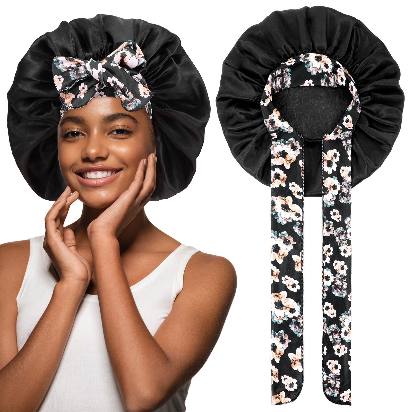 Tyqour Silk Bonnet with Tie Curly Hair Bonnet for Sleeping Double Layer Satin Sleep Bonnet Adjustable Satin Hair Wrap Night Sleep Caps for Women(Black)