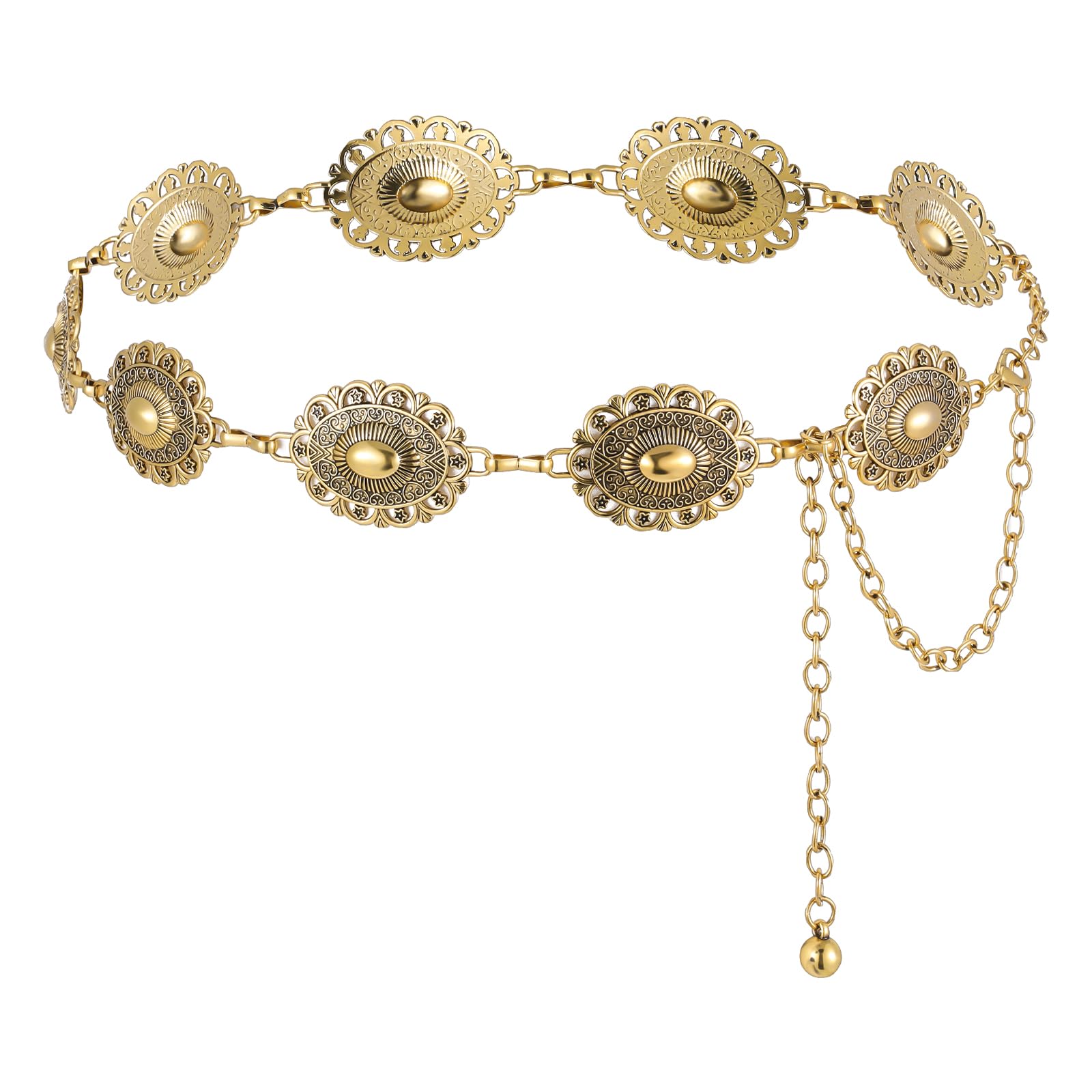 Women Western Metal Chain Belt, Oval Concho Cowgirl Waist Chain Boho Waist Belt for Dresses, Jeans, Shirts, Jackets, Blouses, Jeans Pants (Gold)
