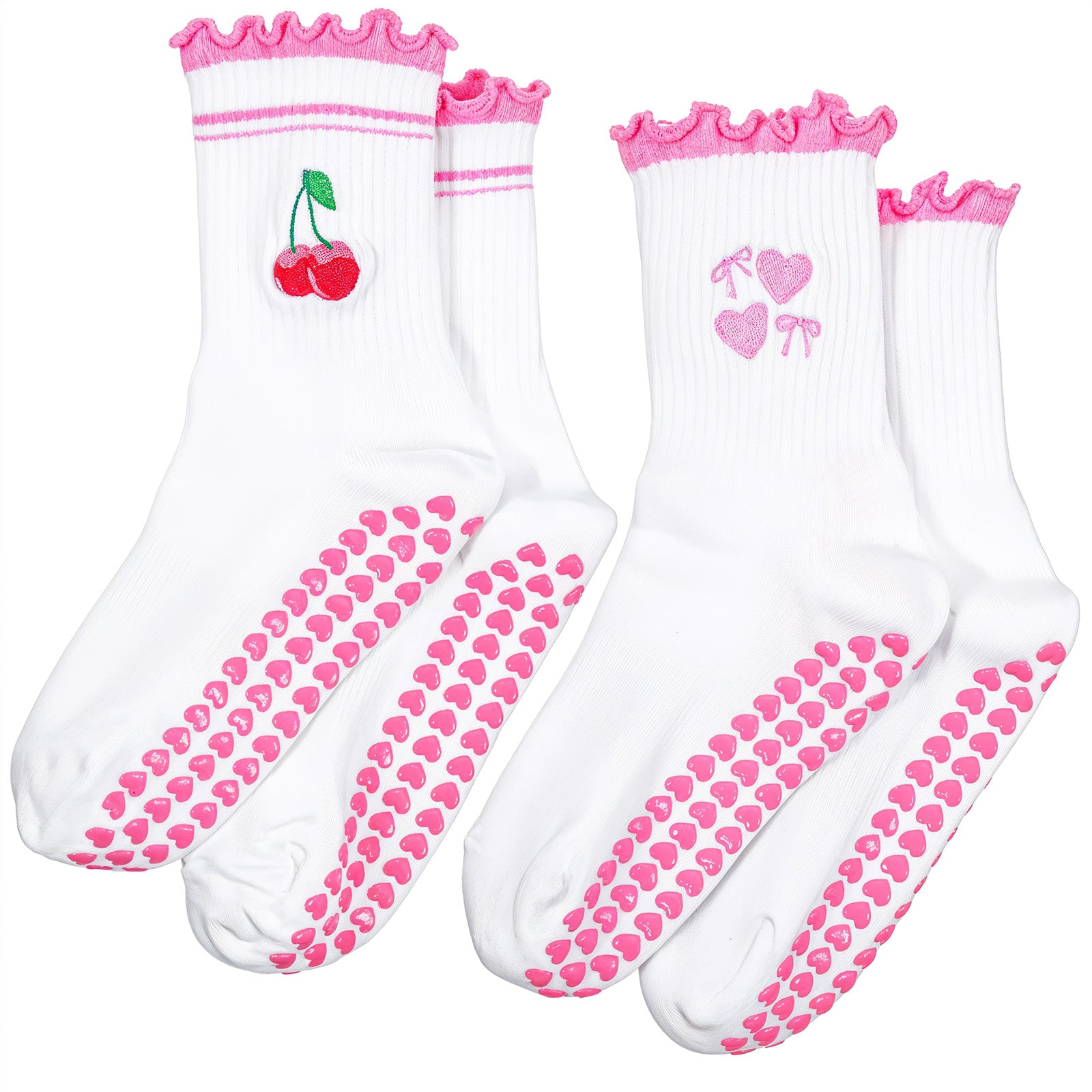 Xinjoduz 2 Pair Pilates Grip Socks for Women, Breathable Cute Reformer Pilates Socks with Grips Non Slip Ruffle Frilly Yoga Sock Cotton Crew Grippy Sock for Barre Workout, 5-10 Inch (Cherry, Heart)