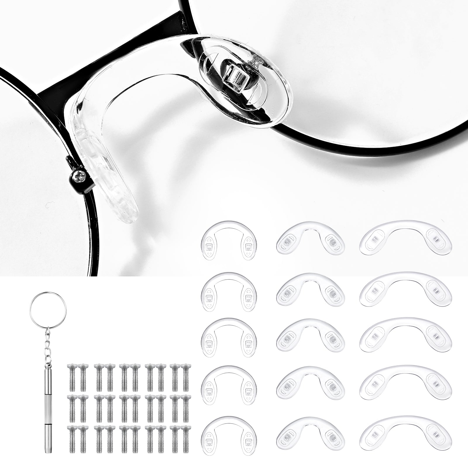 Universal eyeglass pads for nose are suitable for most screw-in eyeglasses, eyeglasses, frames, decorative eyeglasses, single lenses, full-frame eyeglasses, sunglasses, plastic eyeglasses and so on. Nose rests can be matched with a variety of frames to make your eyeglasses feel great and comfortable.<br>