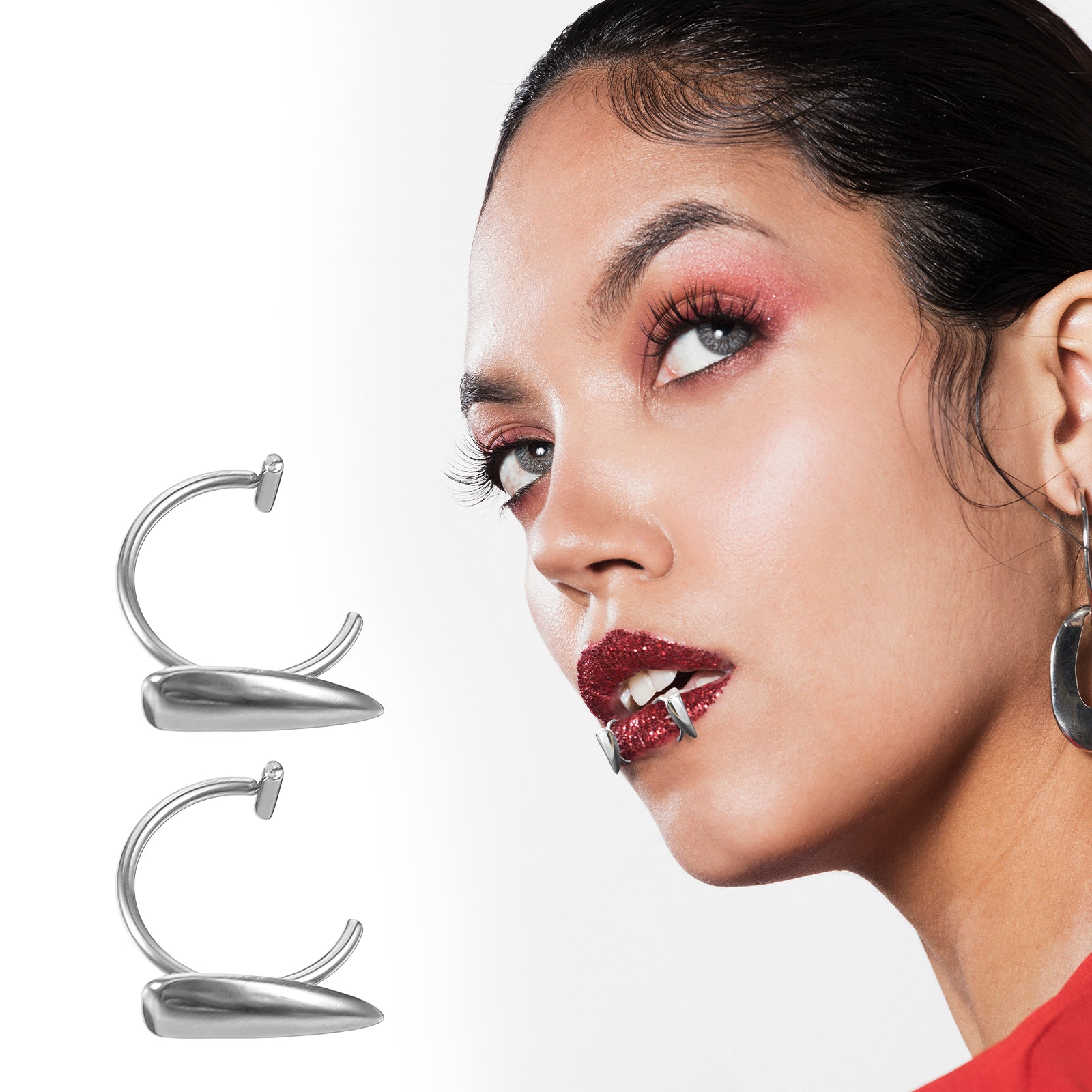 Ymapinc 2-Piece Stainless Steel Fake Lip Ring Piercing Vampire Fang & Wolf Tooth Gothic Jewelry Set Non-Piercing Clip-On Fangs for Women & Men Halloween Cosplay Accessories