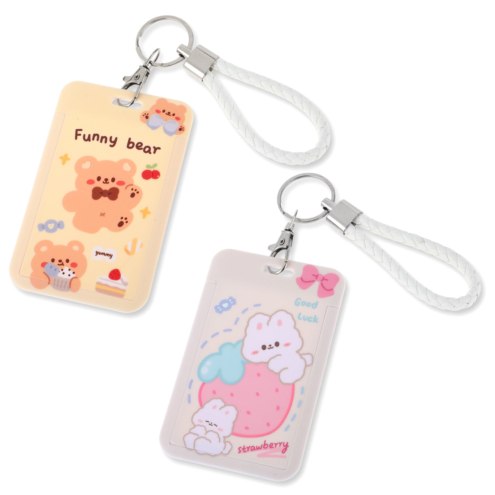 Ymapinc 2Pcs Photocard Holder Keychain, Suitable for Work ID Membership Credit Cards, Cartoon Animal Design (Hugging Strawberry Rabbit & Cake Bear), Plastic Pink & Yellow with White Bracelet