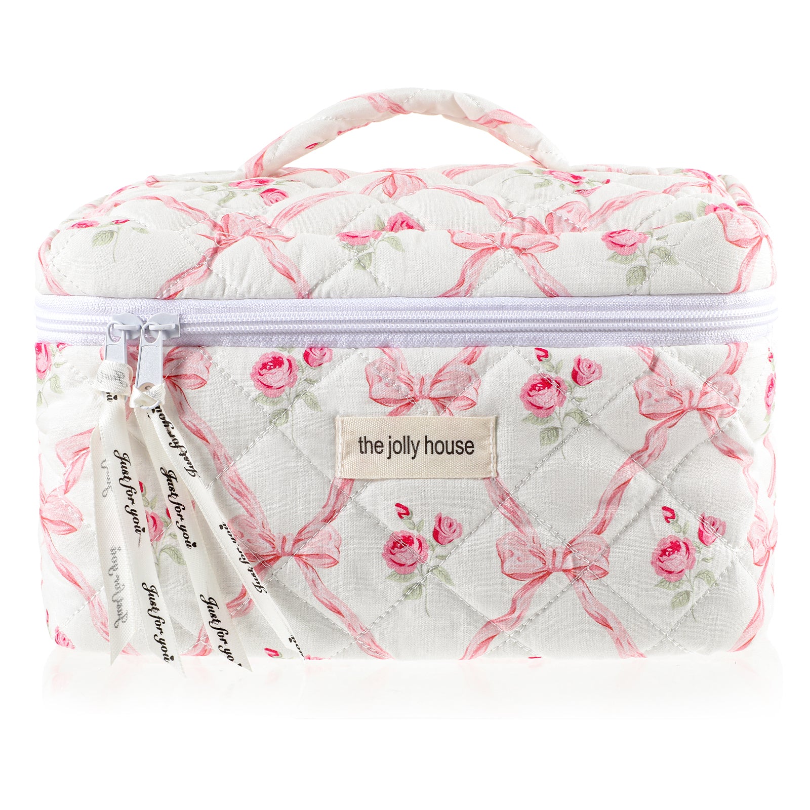 Ymapinc Double Layer Makeup Bag, Large Travel Pink Quilted Floral Cotton Skincare Case for Women Floral Flowers Makeup Organizers with Inner Zipper Bag(Pink Cotton)