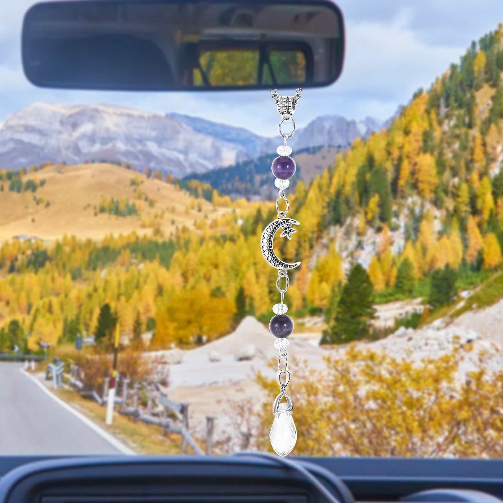 Ymapinc Moon and Star Rear View Mirror Accessories, Witchy Decor Charm Gifts Car Hanging Ornament for Women Men Boho Crystal Amethyst Stone Bead Healing Car